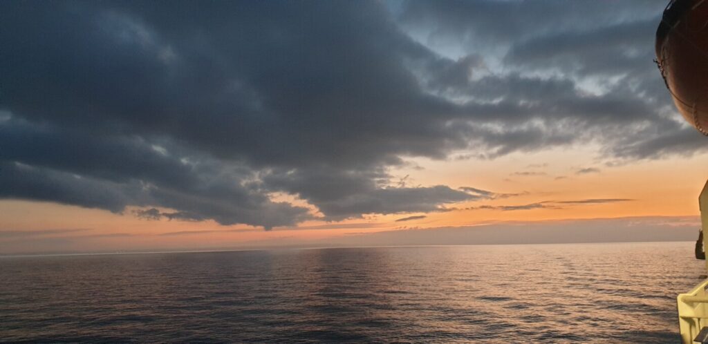 I arrived at the ferry around 3pm checked in, stood in the queue for a bit with a number of other cyclists (most of whom were planning on touring the flat areas of Holland, Belgium and Germany) before boarding and securing the bike.