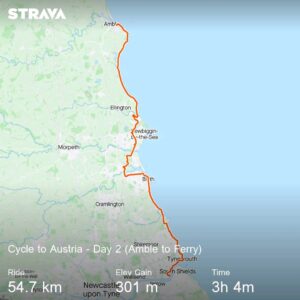 Day 2 was planned as the shortest day of the trip as I only had to get to the ferry port at North Shields and the ferry to Ijmuiden/Amsterdam was only due to leave at 5pm. It was just over 50km to get there and that wasn’t the most direct route. I chose to hug the coast as much as possible and left Amble around 10am.